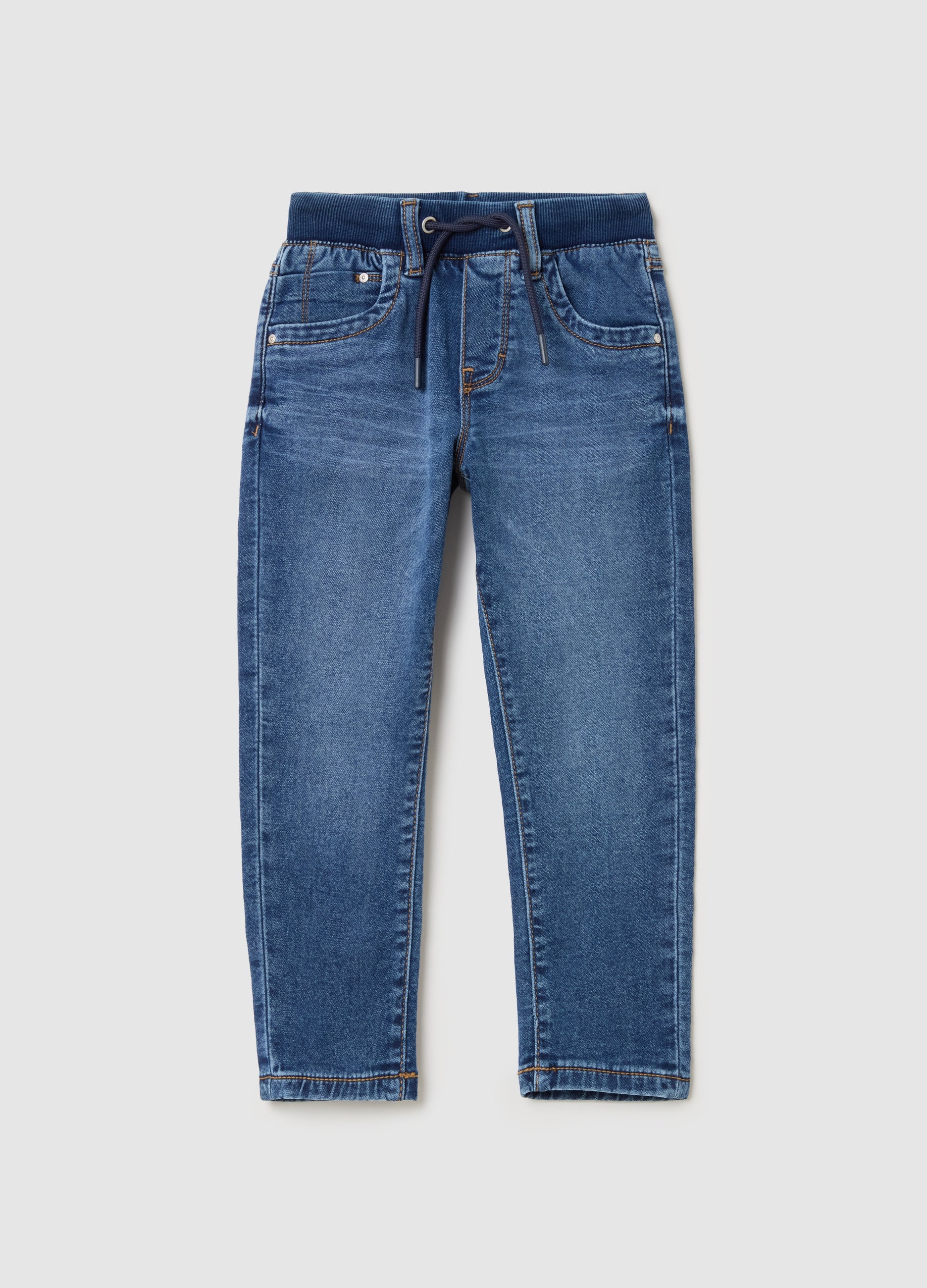 Tapered-fit joggers in stretch cotton blend denim. Elasticated waist with cord drawstring. Five pockets.
