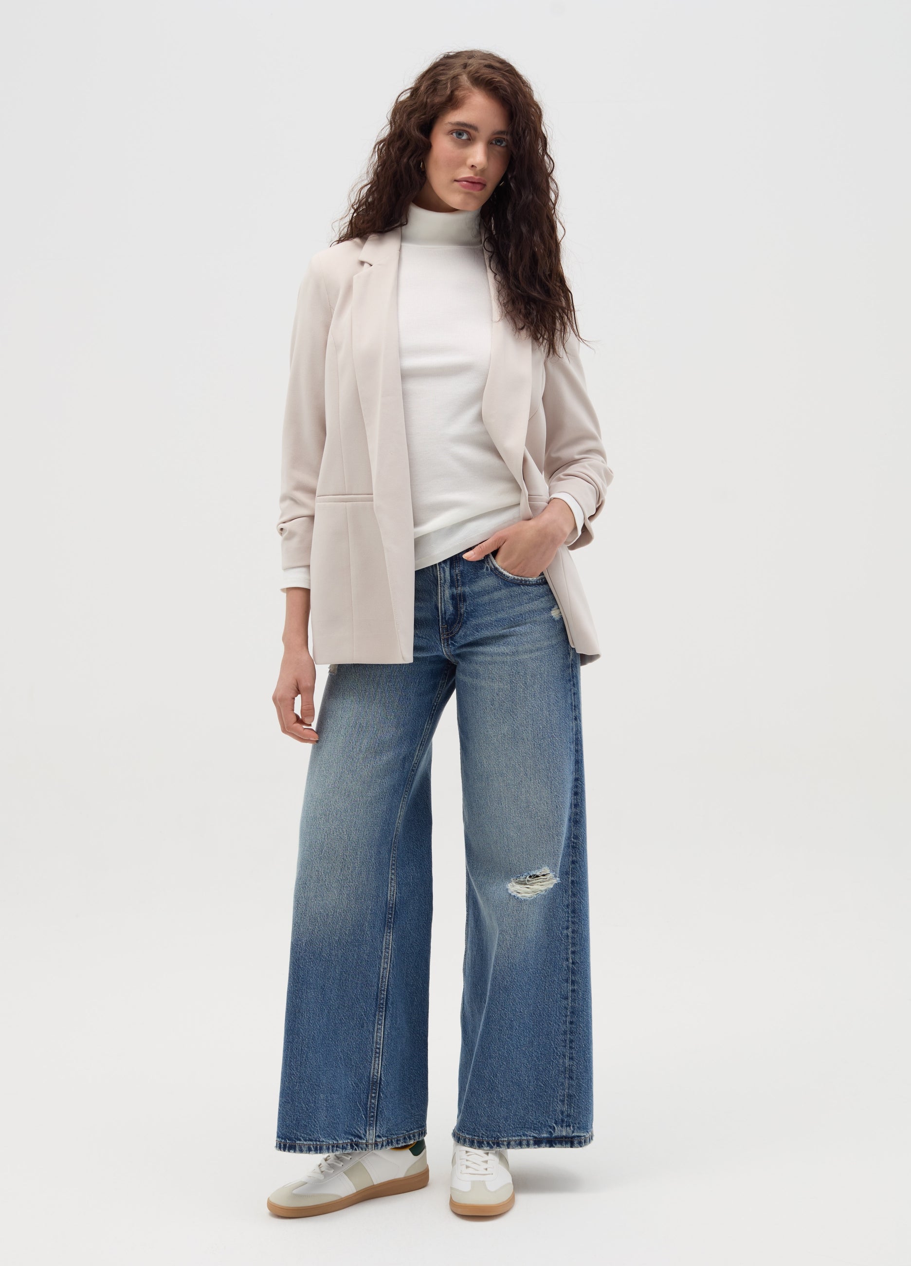 Open blazer in solid colour stretch fabric. Three-quarter sleeves with frills. Two horizontal welt pockets.