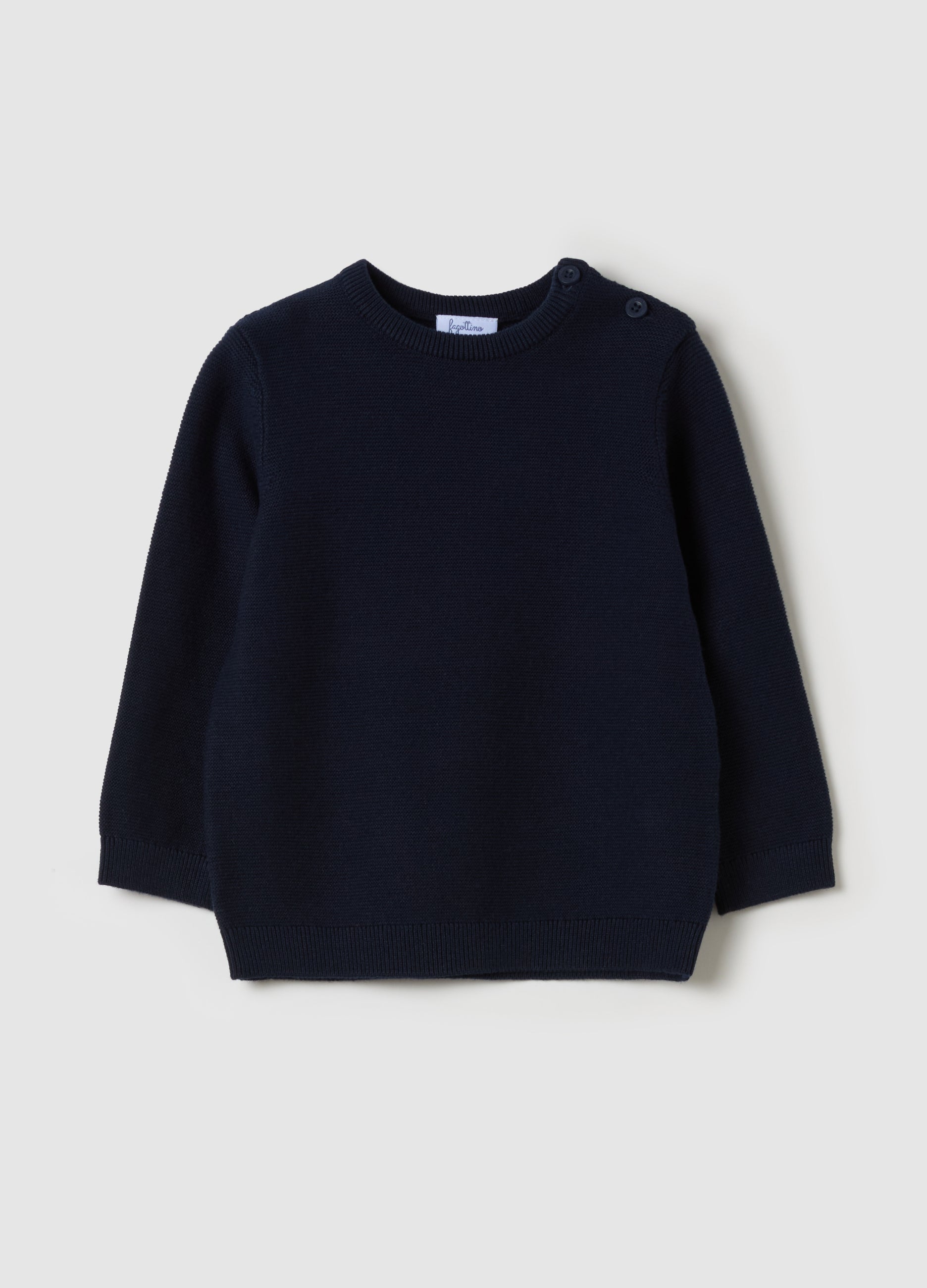 Solid colour pullover in 100% cotton yarn. Round neck with matching buttons on the shoulder. Ribbed trims.