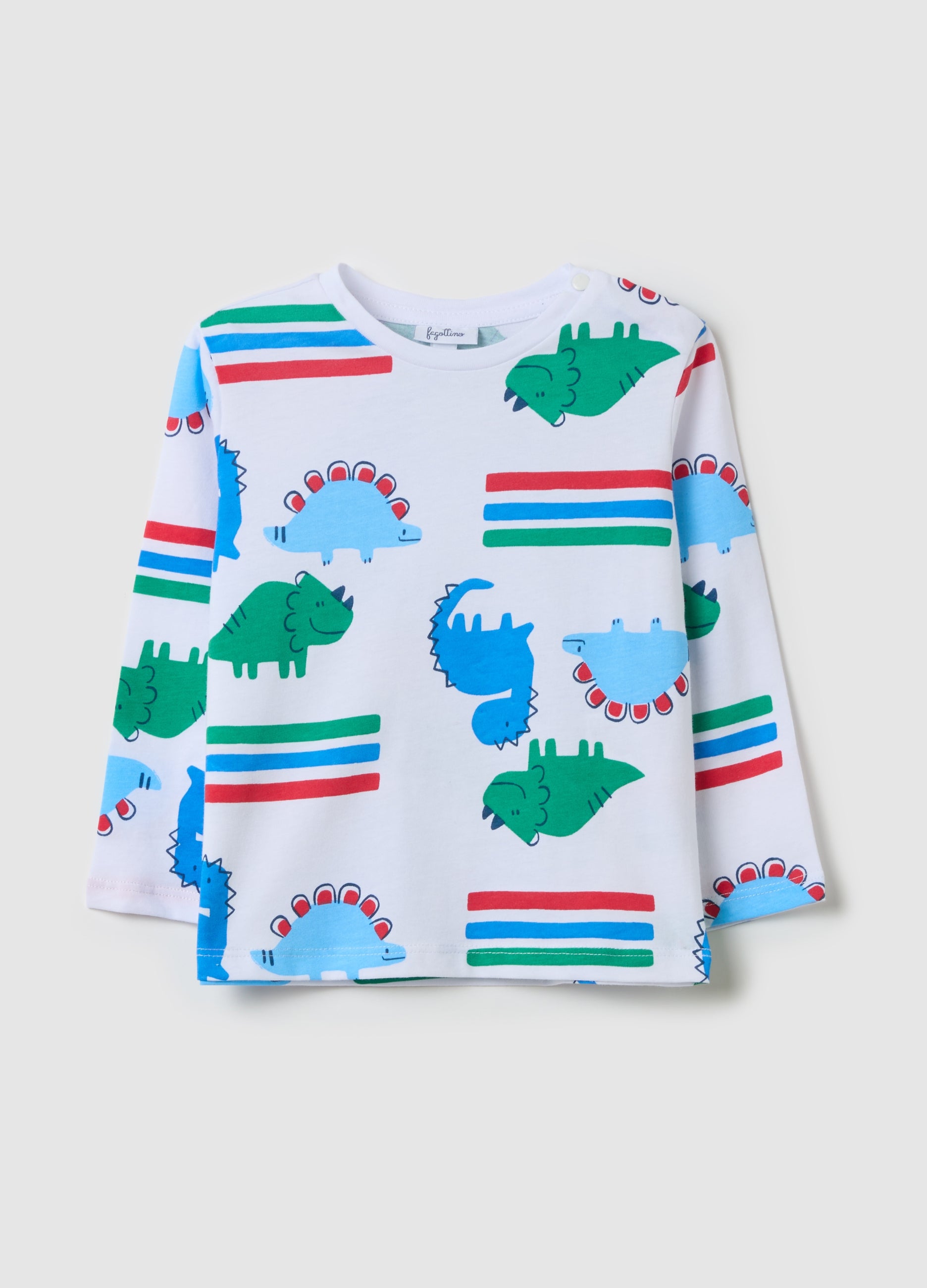 100% cotton t-shirt with long sleeves. Dinosaurs print with all-over striped bands. Round neck with snap button on the side.