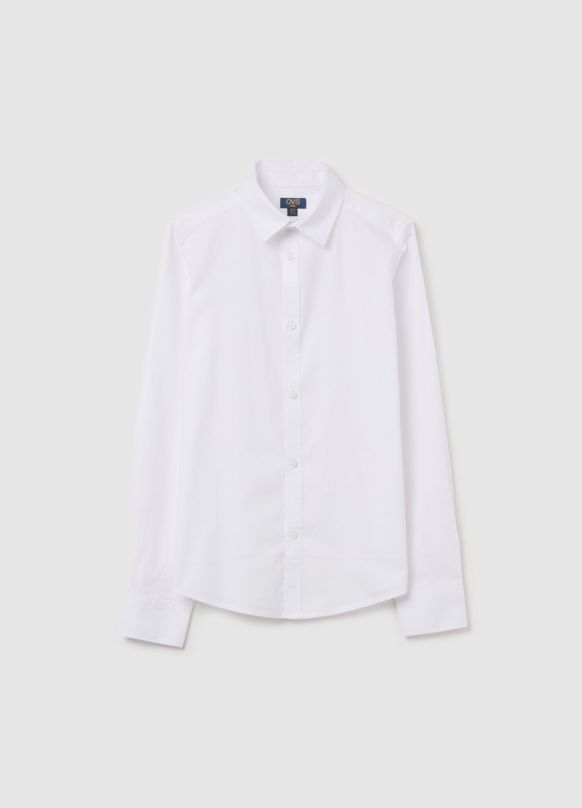 Solid colour shirt in 100% cotton. Bluff collar. Yoke on the back. Button fastening.