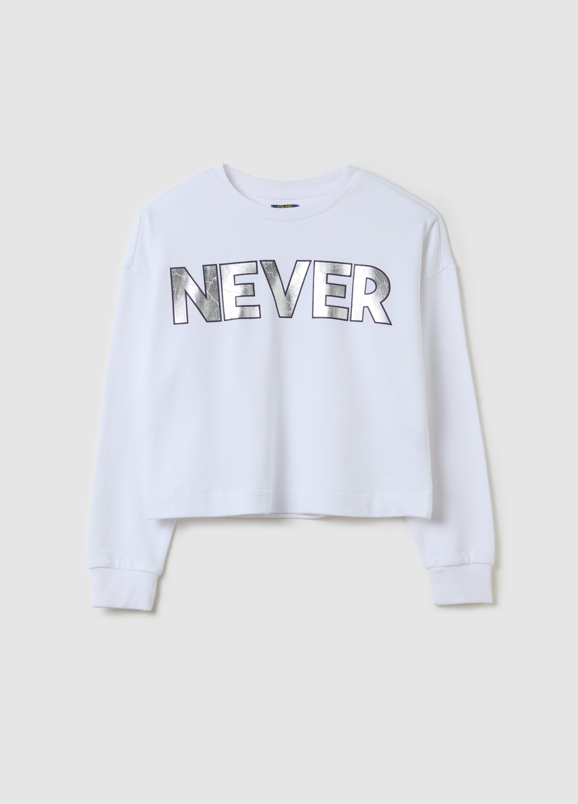 Cropped sweatshirt in 100% cotton. Round neck. Drop arm opening. ''never'' lettering print in foil on the front.