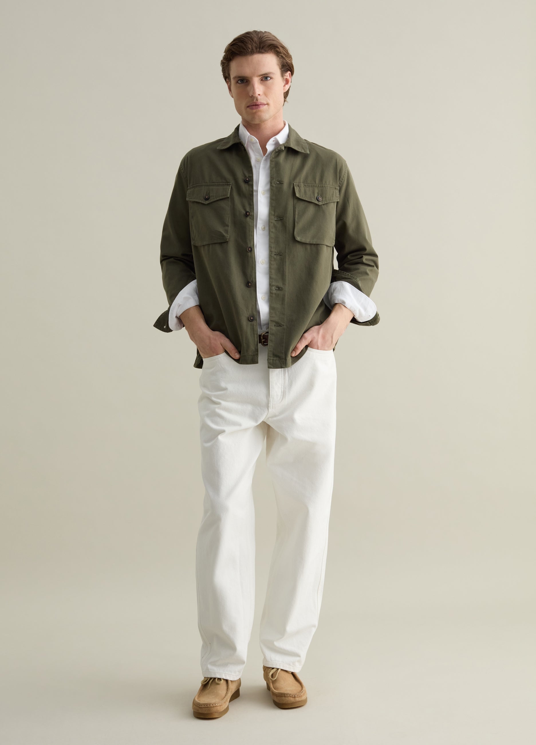 Piombo solid colour shacket in 100% cotton. Two pockets with flap and button on the chest. Fastening with streaked buttons.