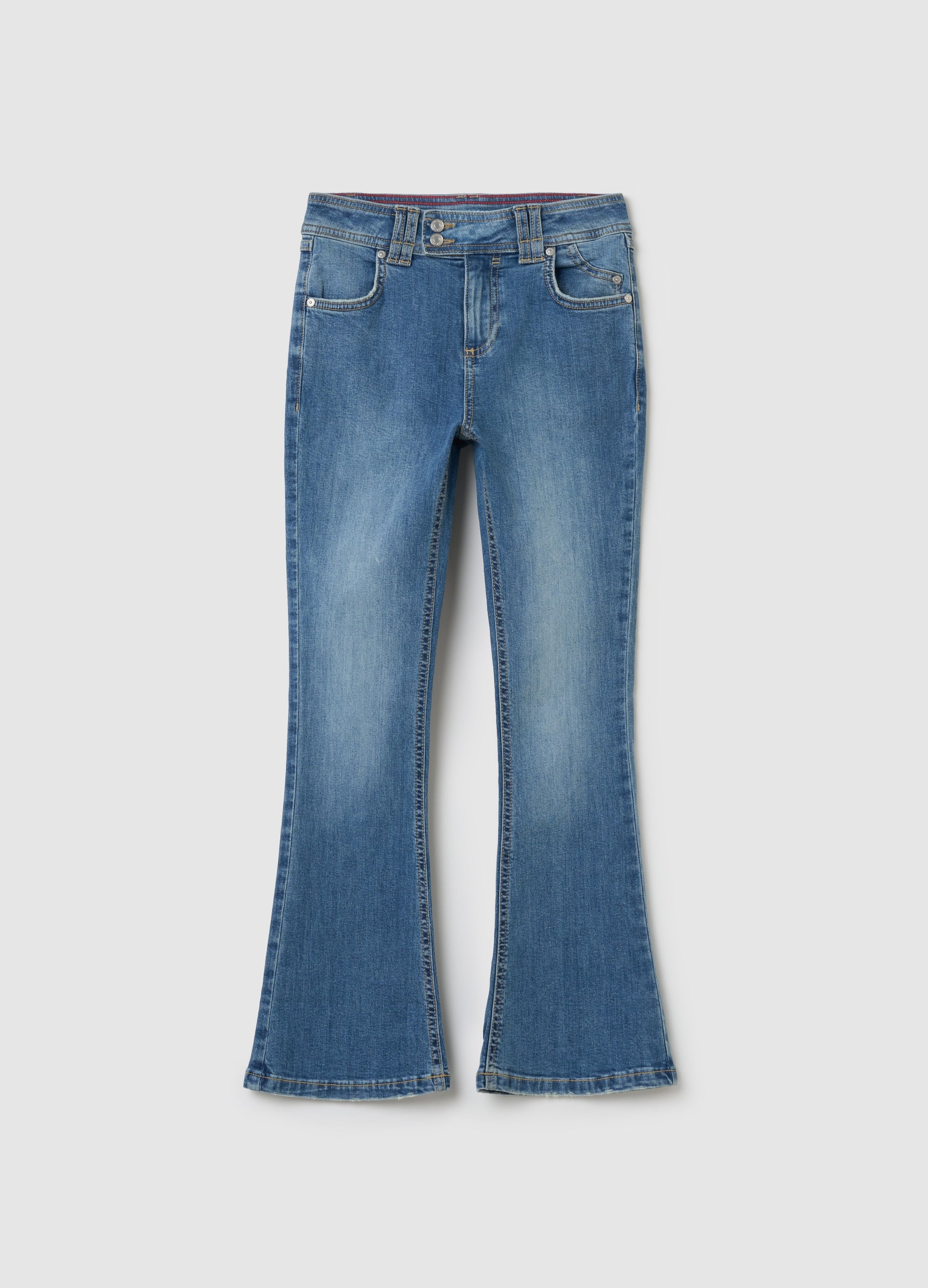 Bootcut jeans in stretch cotton. Internal waist adjustment. Two front pockets and two patch pockets on the back. Double button fastening and zip at side.