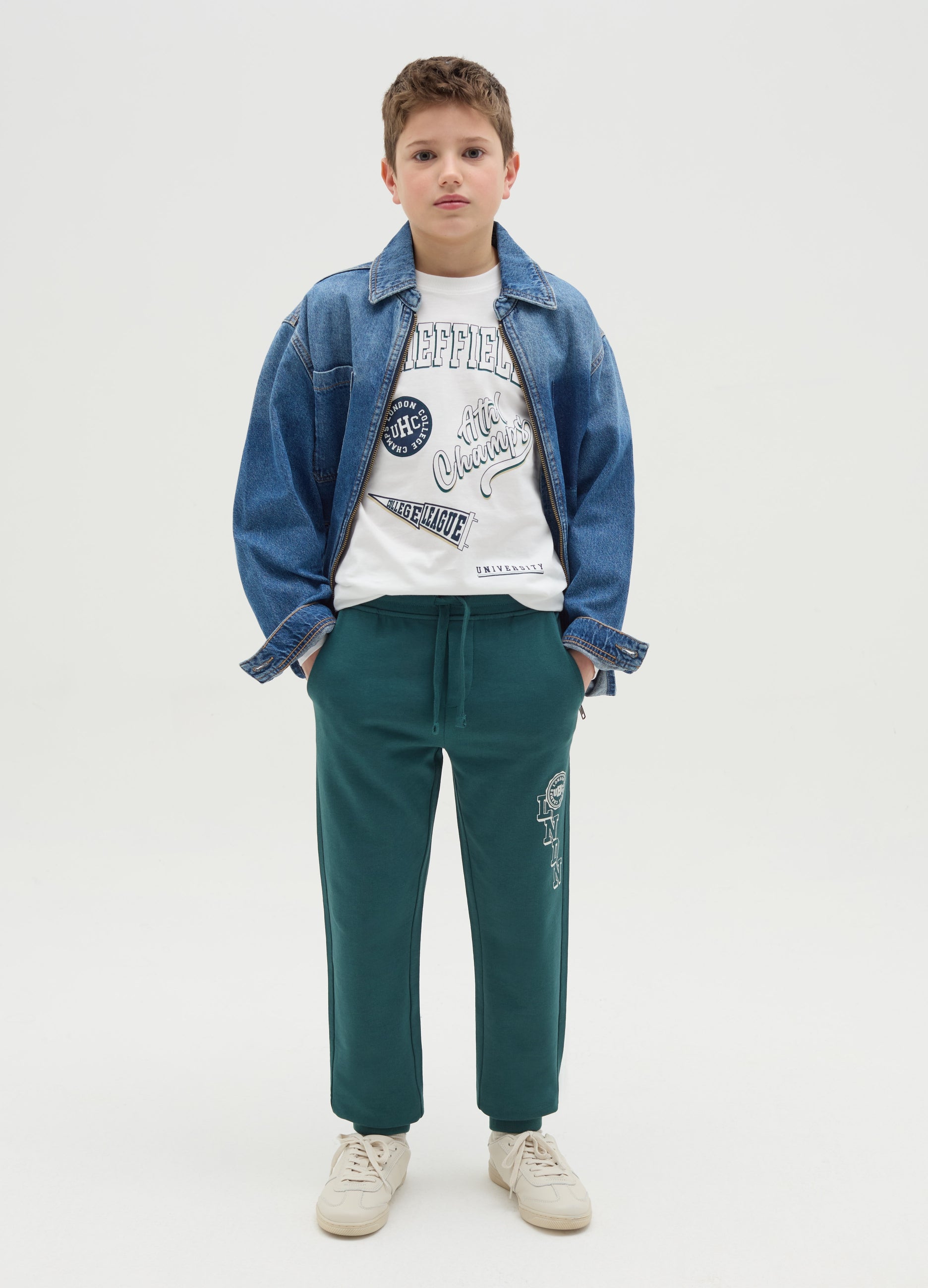 Slim-fit joggers in 100% cotton fleece with sash drawstring. Two slant pockets and one patch pocket on the back. ''lndn'' lettering print and college crest on the side.