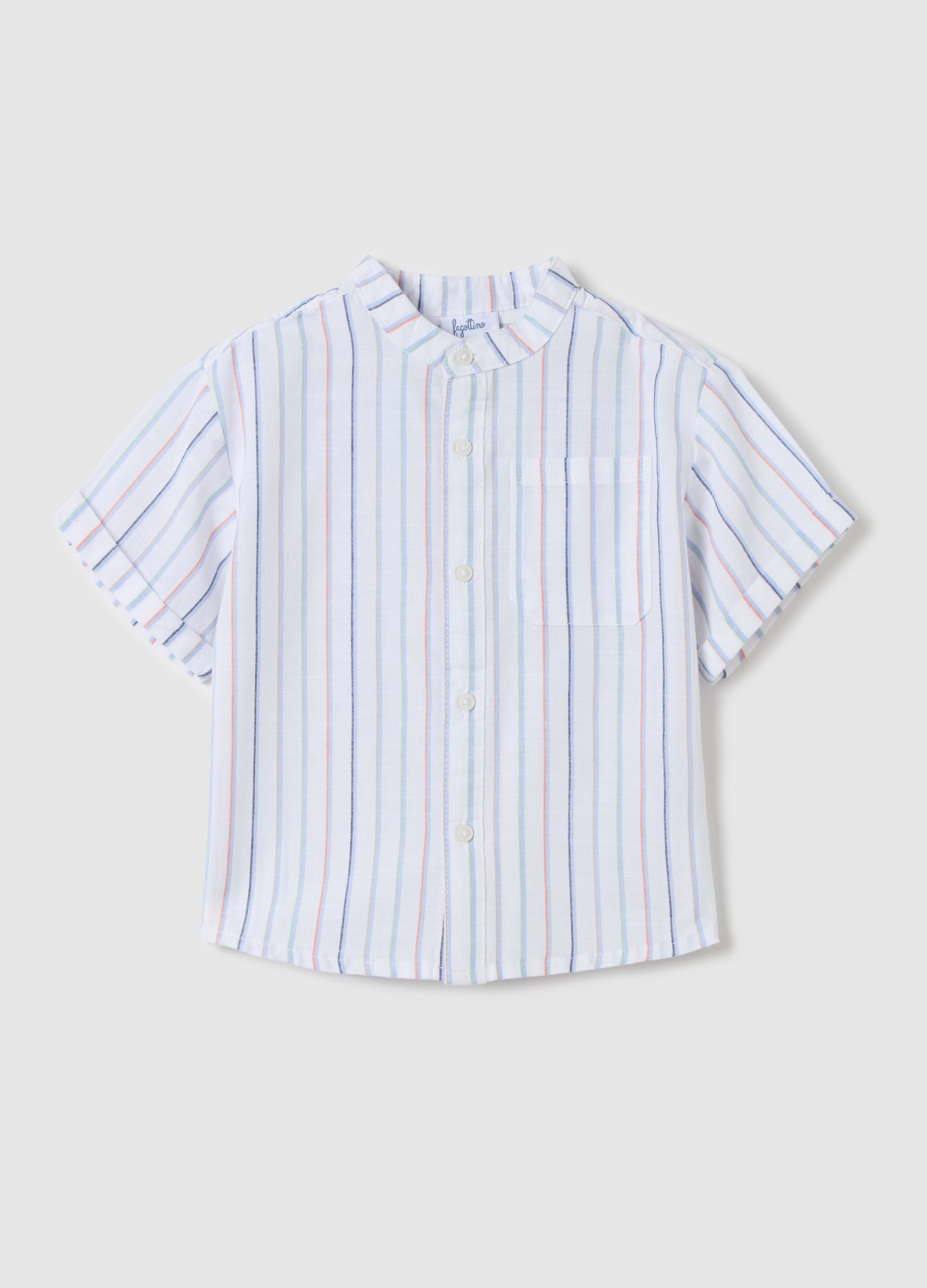 Short-Sleeved Shirt In 100% Cotton. Stand-Up Collar. Yoke On The Back. Pocket On The Side. Multicoloured Fine Stripe Pattern. Button Fastening.