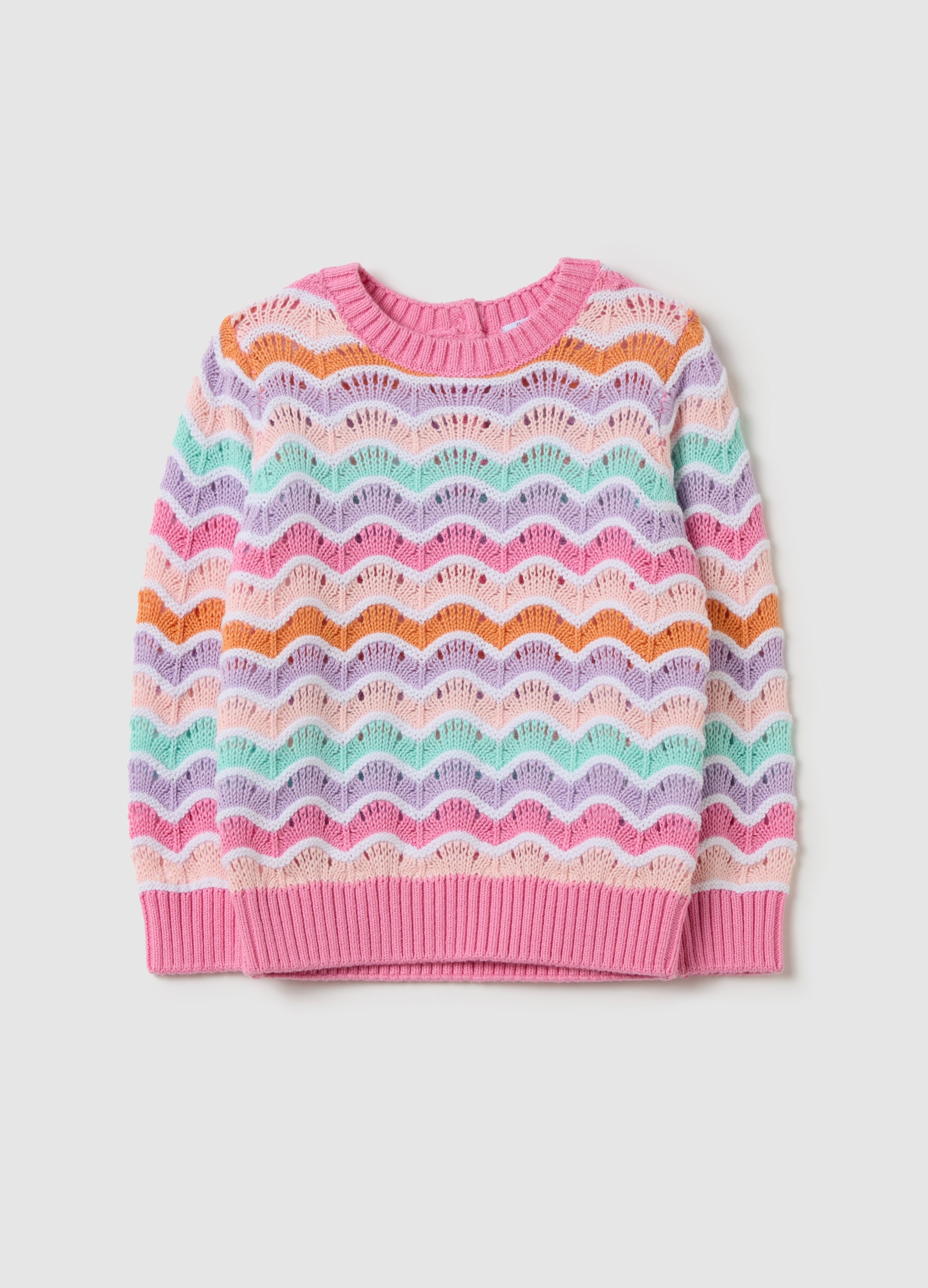 100% cotton pullover with openwork design and multicoloured waves motif. Round neck. Ribbed trims. Button fastening on the back.