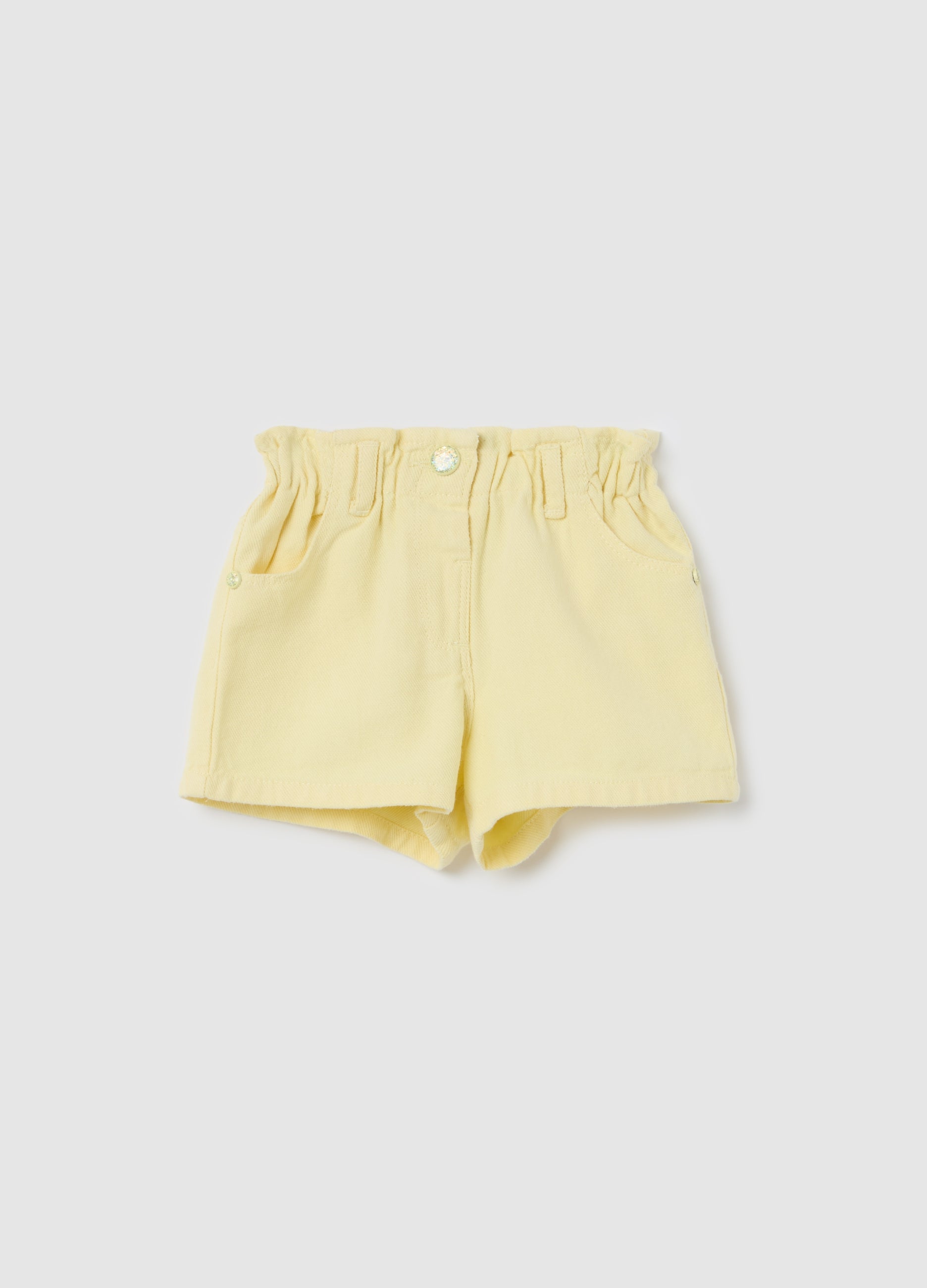 Paper bag shorts in cotton and lyocell. Elasticated waist. Two slant pockets and two patch pockets on the back. Snap button fastening.