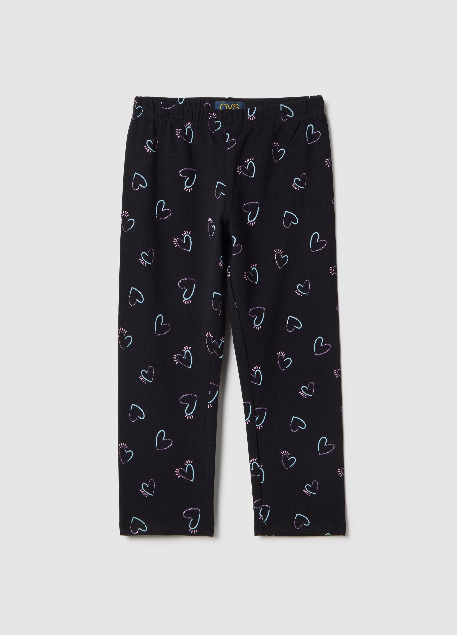 The Black Stretch Cotton Leggings From The Ovs Kids Line Are Ideal For Girls Aged 3 To 10, Providing Comfort And Freedom Of Movement. They Feature A Lively Design With Colourful Heart Motifs, Adding A Fun Touch To The Look. The Elasticated Waistband Ensures A Practical And Skinny Fit, Perfect For Active Days.