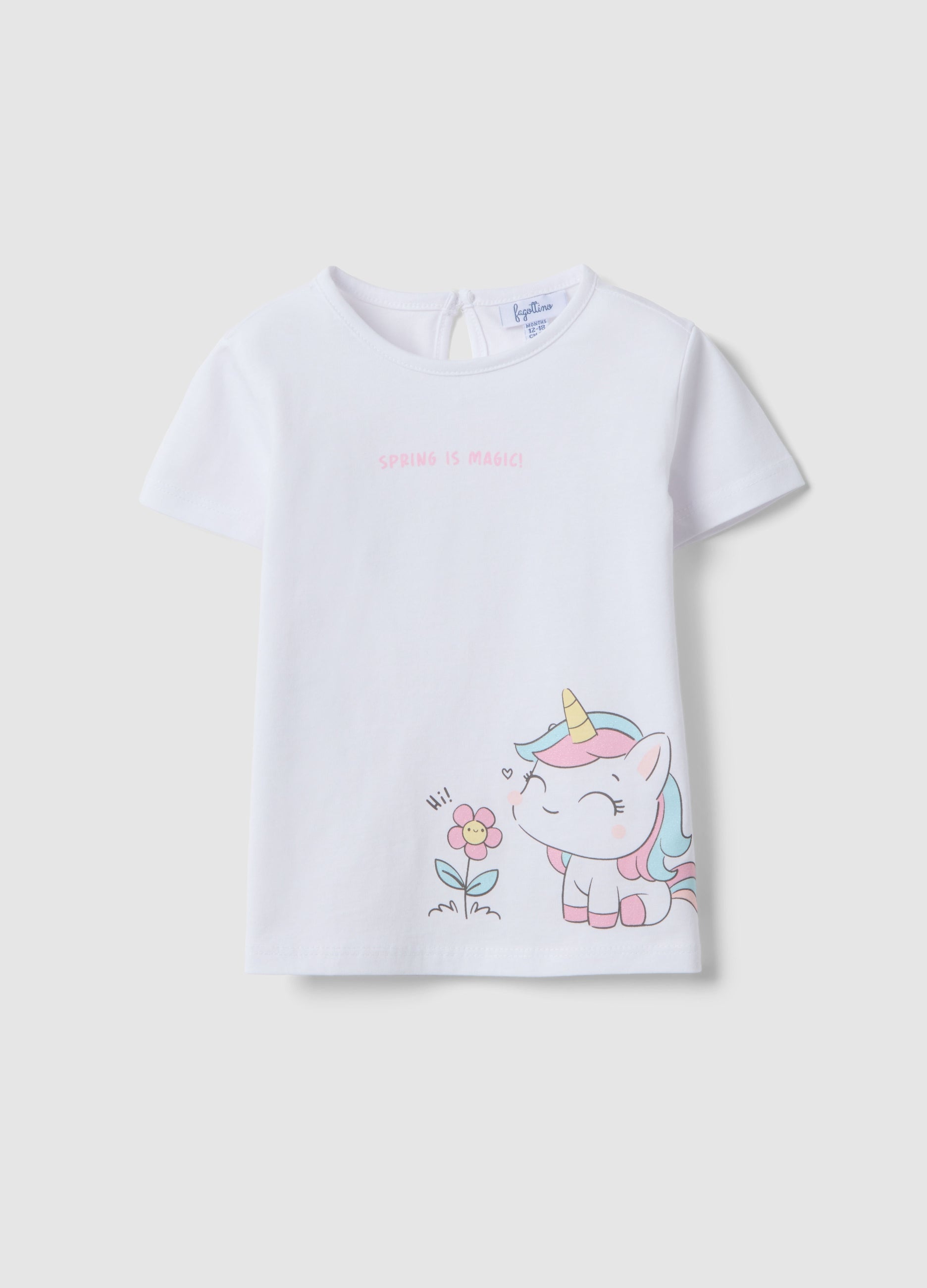 This White Pure Cotton T-Shirt From The Fagottino Line For Girls Aged 9 To 46 Months Is Adorned With An Adorable Unicorn And Flower, Offering Softness And Comfort. The Round Neck And Drop Button Closure At The Back Make Dressing Easier, Making It A Practical And Pleasant Garment To Wear.