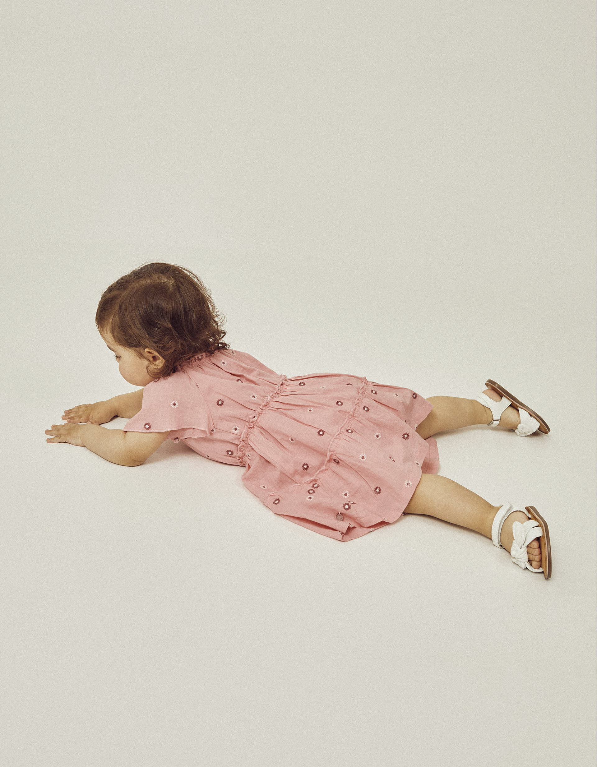 Two-piece set for baby girls, made from 100% cotton, in shades of pink. Embroidered flower pattern. It is composed of a dress with round neckline and elastic. With frills and an evasé effect. Also includes matching bloomers. A lovely outfit, perfect for daily life and also for special occasions.