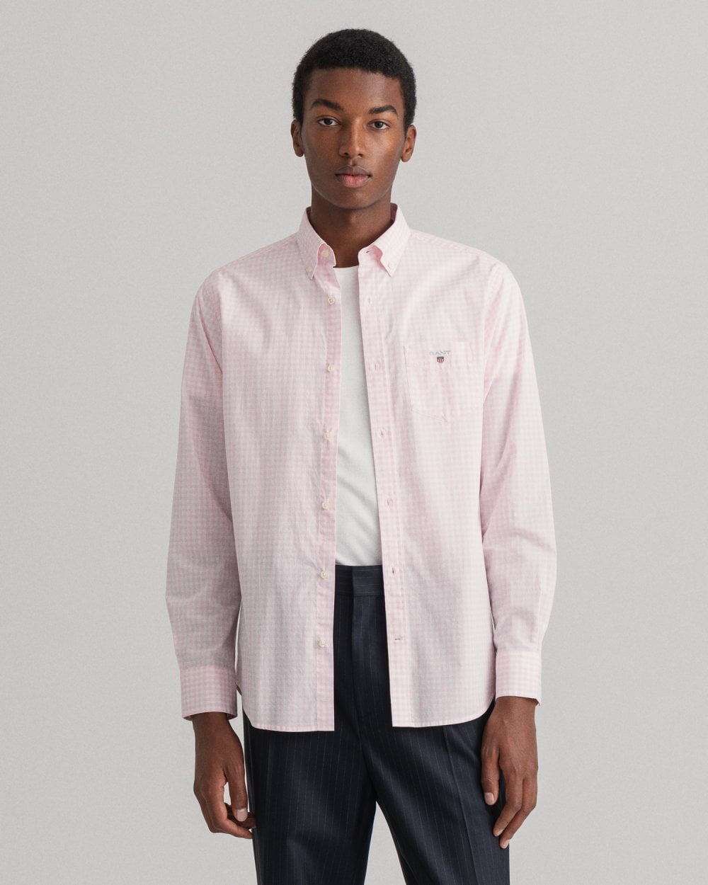 Crafted in cotton broadcloth with a gingham pattern, this regular fit shirt has our signature button-down collar, logo embroidery at the chest, and locker loop and boxpleat at the back.