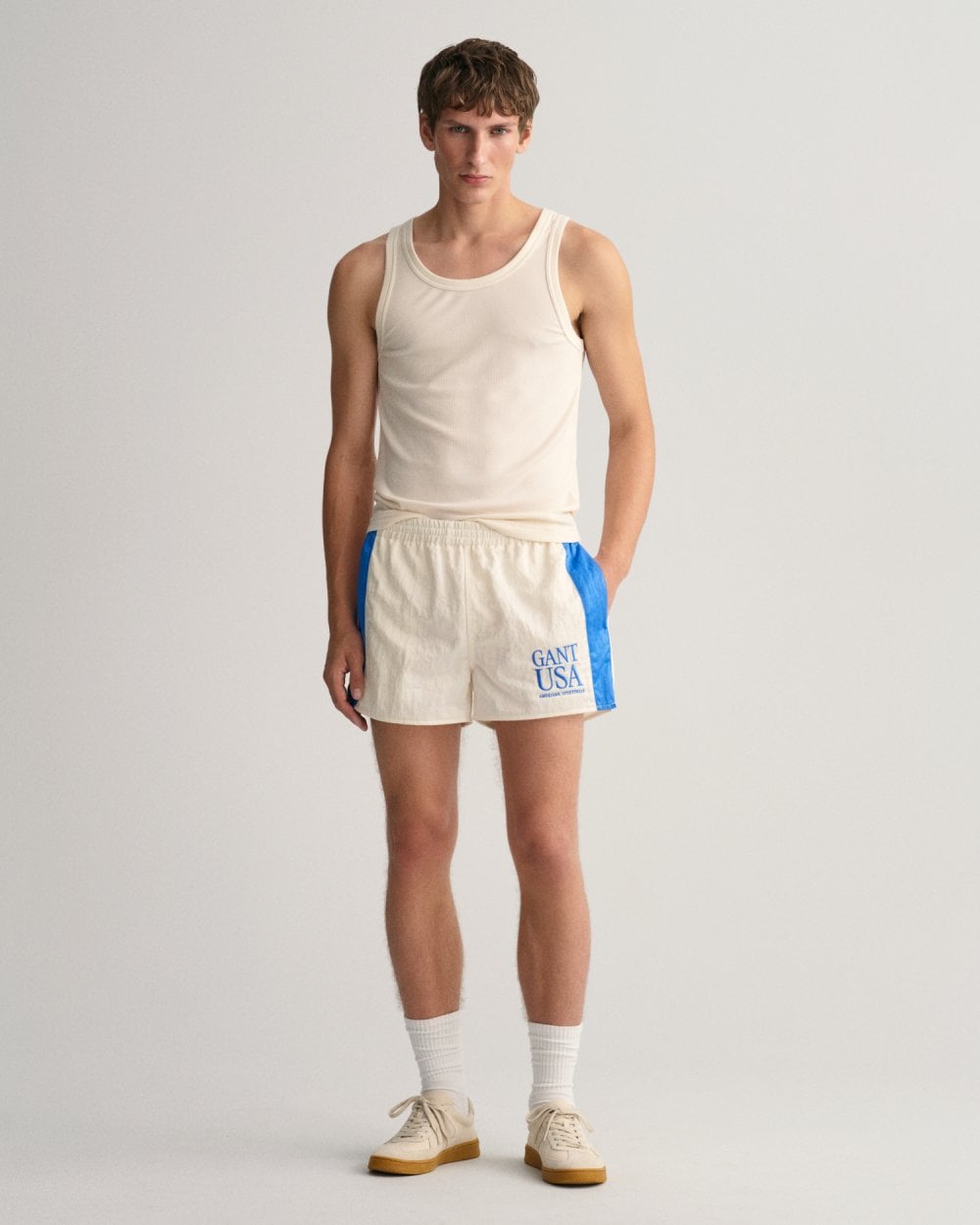 Inspired by 80s activewear, these shorts are made from polyamide with a crinkled satin look. They feature an elastic waist with an internal drawstring and front pockets within the side seam. The contrast color side panel and slit detail at the hem add unique and elevated elements to this modern take on a classic runner's short.